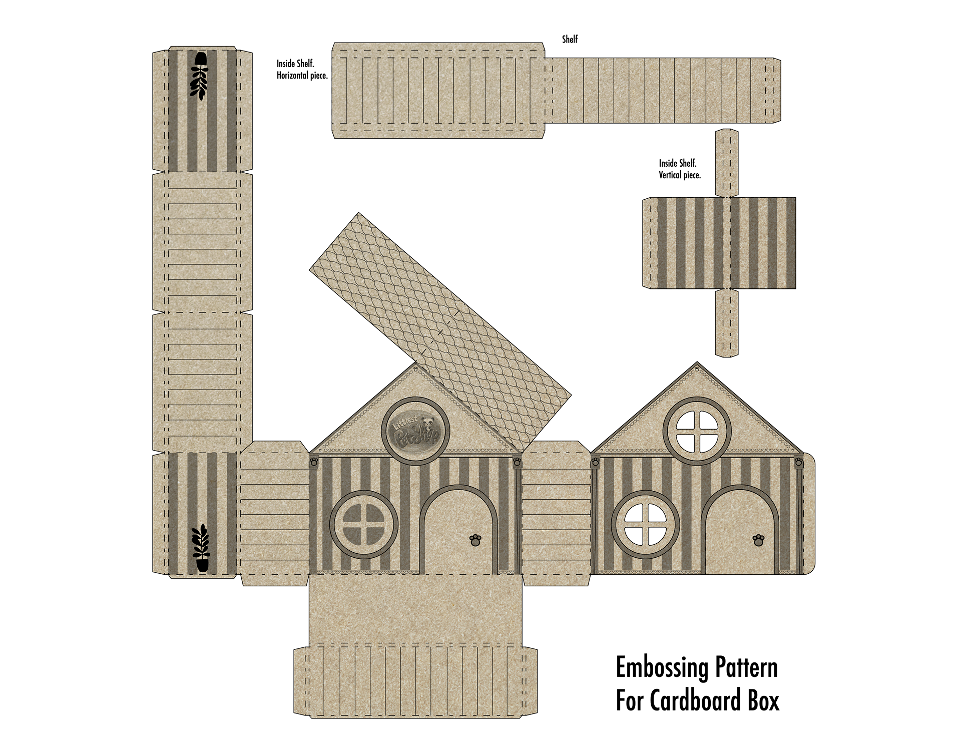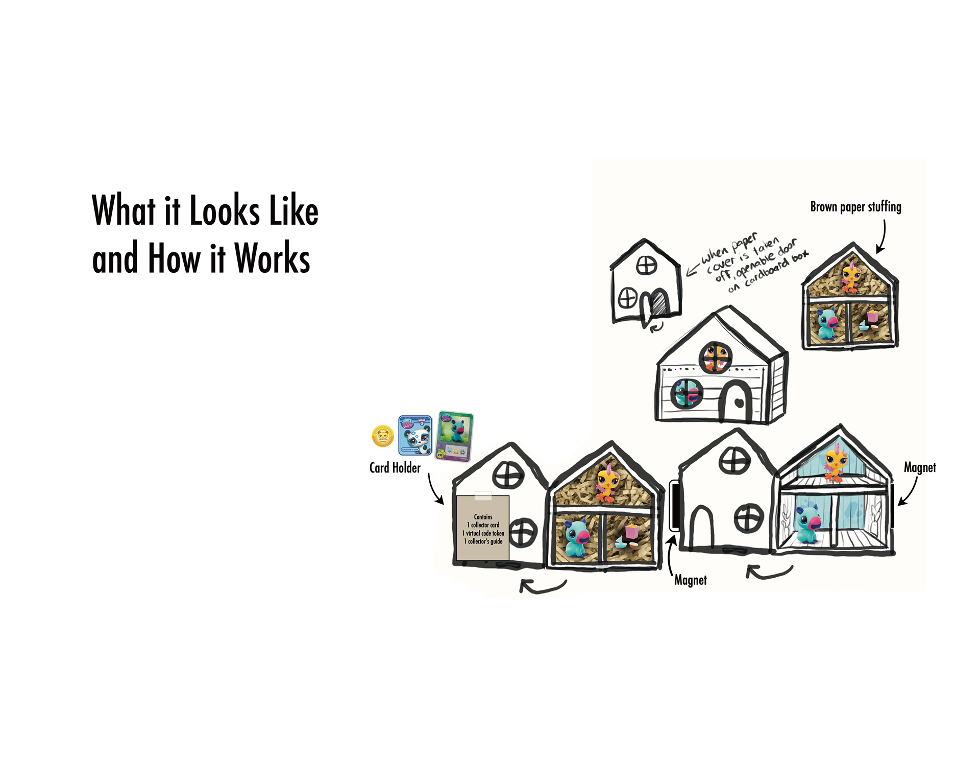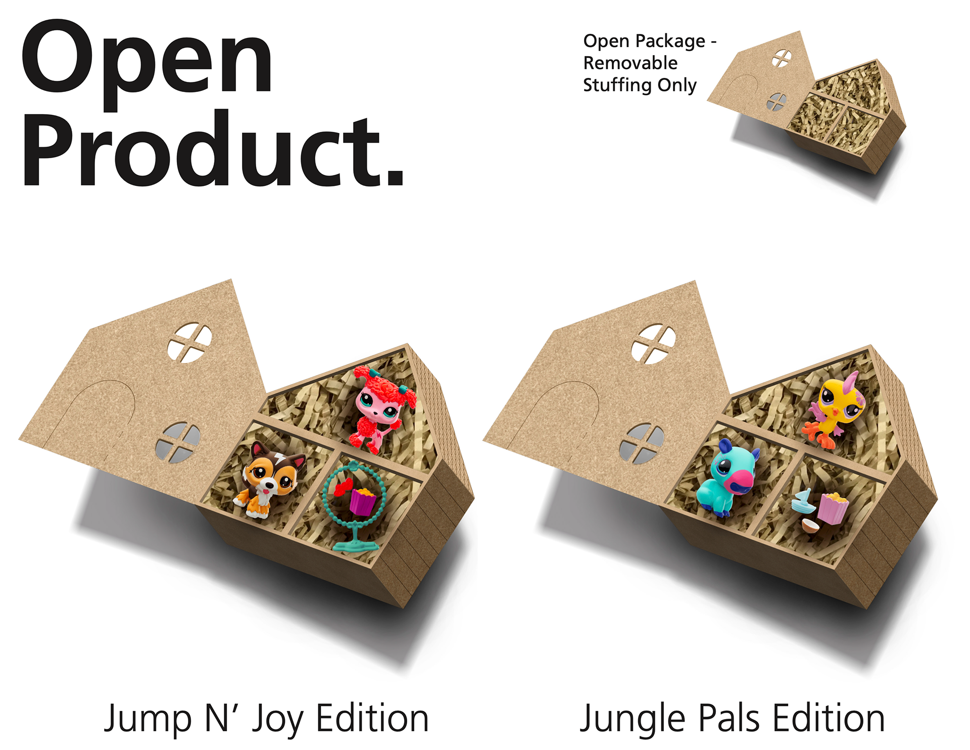 The new structure transforms the package into a recyclable and reusable cardboard playhouse, complete with a functional door and two levels. The outer wrap works as the seal and is made from recyclable paper, designed for easy removal. Die-cut windows showcase the toy figurines inside, while biodegradable paper strips replace plastic stuffing. This redesign offers both environmental and emotional value, extending the life of the packaging through imaginative reuse.